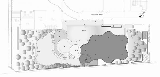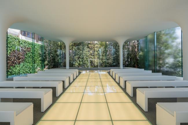 教堂向前方的花园和绿植墙敞开。 同时,其左侧面向一个水池,并被一面绿植防火墙所限制,用以隔离教堂与主礼堂大楼。