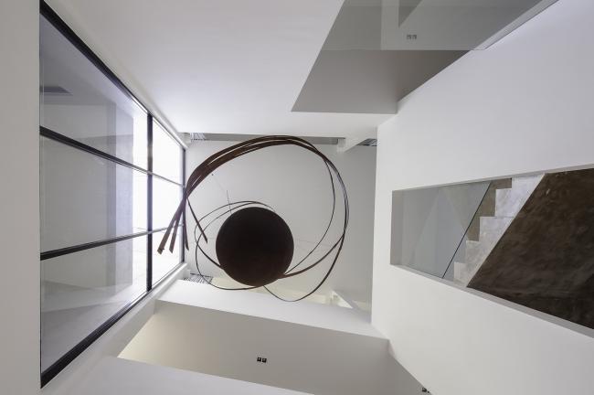 玻璃与混凝土的结合呈现出具有雕塑感的楼梯,楼梯构成中庭的一面边界,不仅增强了空间通透感和流动感,还能在人们上下楼梯时营造一种若隐若现的视觉体验。