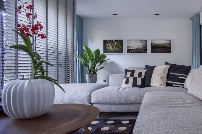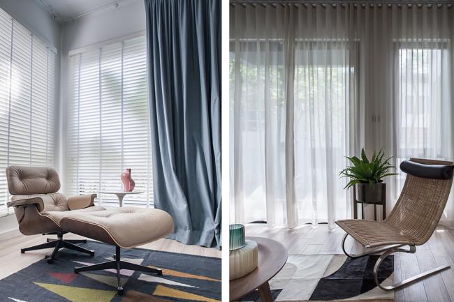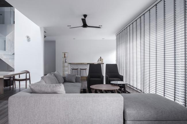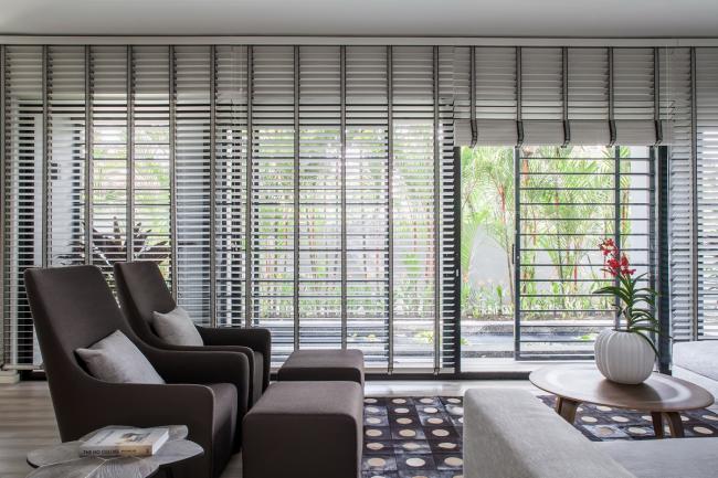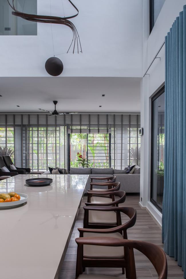 此住宅的设计美学以功能为驱动,由白墙、外露水泥、木纹地砖组成的简约室内装饰便于维护和保养,且所有材料均来源于当地。中庭设计辅之以吊扇加速空气流通,窗帘和百叶窗进一步遮挡阳光照射。这些被动式节能设计让这座亚洲当代住宅极具可持续性,成为远离尘嚣的理想安静居所。