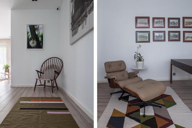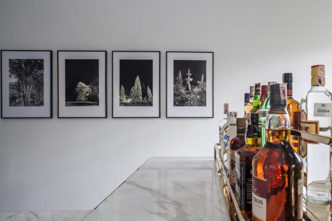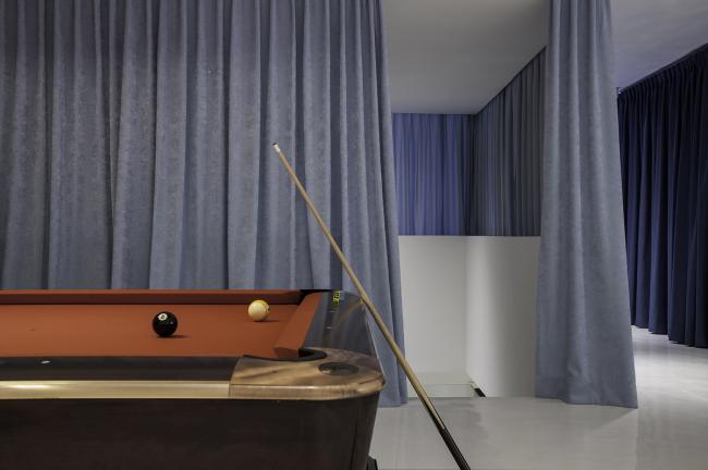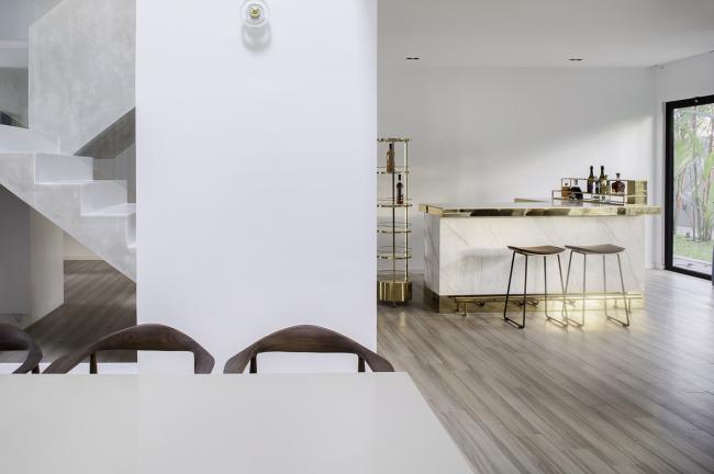 这个三层建筑分别满足三种不同的需求:生活功能、休息功能、娱乐功能。住宅底层设有起居室、餐厅以及用黄铜、大理石打造的特色酒吧;第二层配有4间卧室、1间家庭活动室以及1间书房;第三层是U型开放空间,一侧配有健身房,另一侧是游戏室。中庭北面是全高玻璃幕墙,将柔和的阳光引入整座住宅。