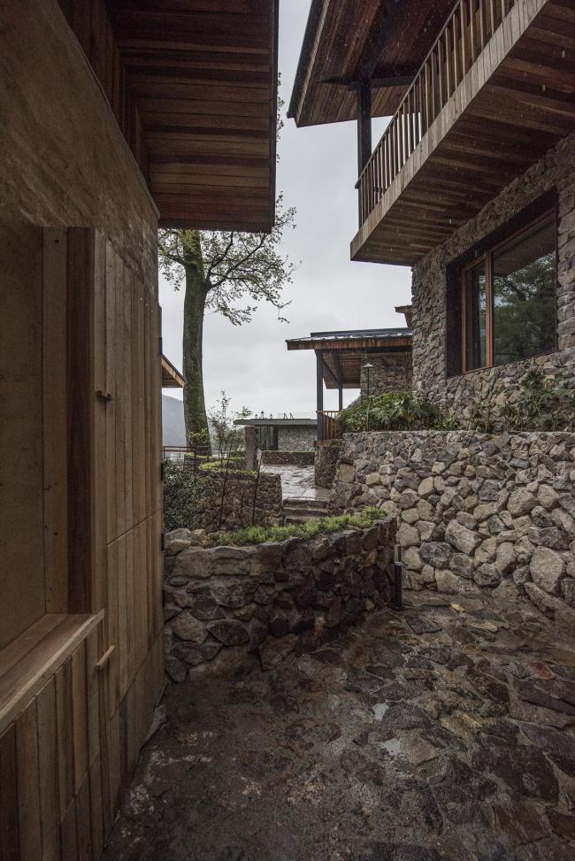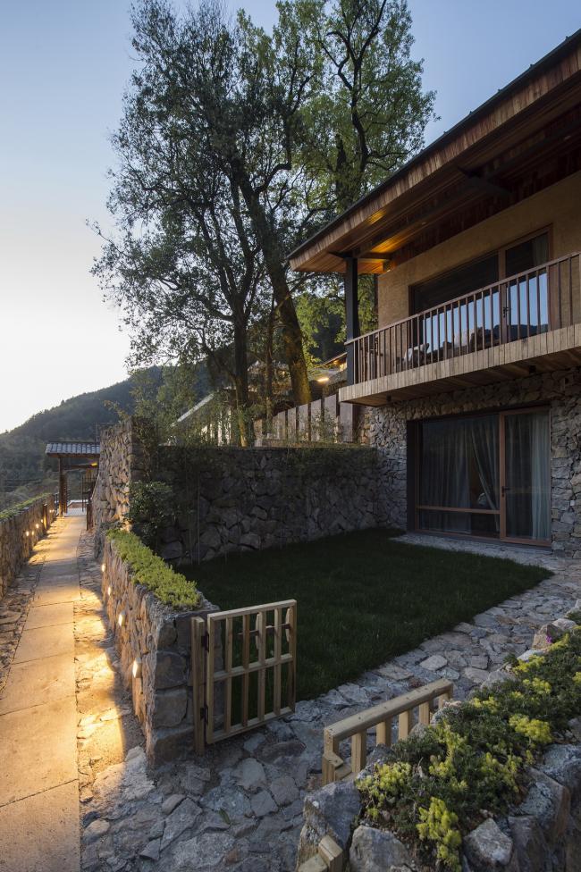由毛石砌筑的台阶拾级而上,巧妙的动线设计让来访者的视线在远山和背山间迂回。爬坡、仰望、转折、远眺,在空间里营造步移景异、曲径通幽的游山之趣。建筑背山面谷,卧于一方宝地,树木遮掩,若隐若现,远山美景可观、百年古樟为邻,透过不同的窗口,在不同的时间里,在不同的建筑高度,都是不同的风景,每一个层次都有不同的体验,每扇窗口外都是整幅无框山野画卷。
