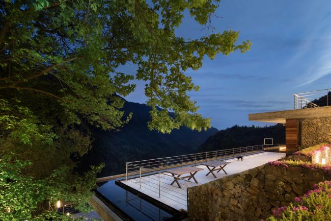 33间客房,配备接待大堂、图书阅览、餐厅厨房、恒温泳池的公共区域,2688㎡的建筑面积,对于一个山间民宿无疑已是巨大的体量。设计以一层或两层的客房错落有致地散落山间,四层的公区以片层形式贴合地形延展,弱化体量的同时,创造出一系列观景露台。各层建筑的顶面和地面与不同高度的山体衔接,层层展开,建筑如从山中生长出来,以最轻柔地方式贴合于山地,隐现于景观。
