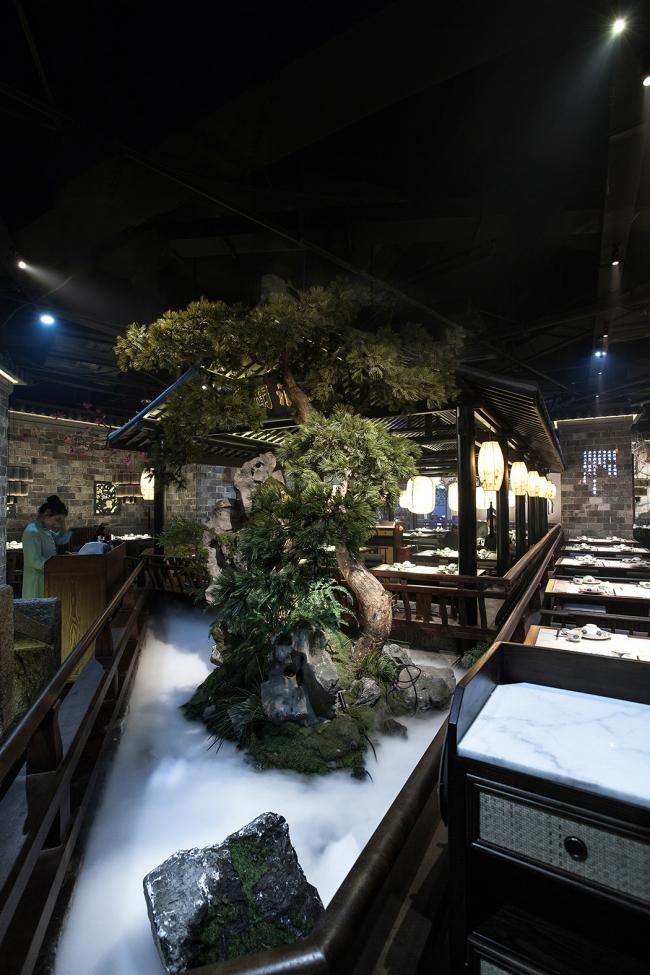 长廊餐区位于整个餐厅的中央,设计师运用干景+雾化的形式突出重点。安徽特有的五针松与灵璧奇石置于浓白水雾中,宛如微型的黄山奇景。