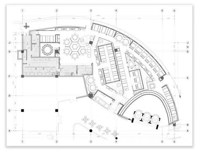此次项目场地局促紧凑,为一延伸的半弧形。特殊的设计条件也凸显了其趣味性。