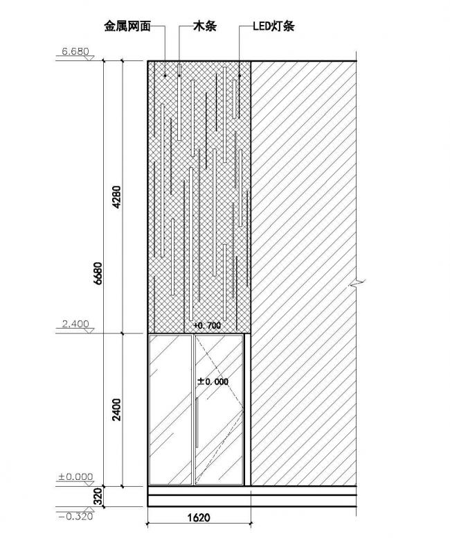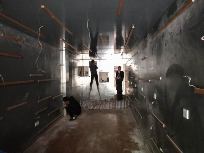 整个空间使用几种材质“拼贴”而成,摒弃了传统室内天花板、墙面、地面的逻辑而进行整体打造。室内空间主要采用四种材料:环氧树脂漆,木条,灯带,镜面亚克力。镜面亚克力安装在狭长空间的尽头,起到反射与延伸空间长度的作用。环氧树脂漆具有漫反射的作用,作为左右墙以及顶面的主要基底材质,给界面以光泽的质感,且使空间视觉上不再封闭。木条和灯条进行三种不同的墙面操作:纯木条、纯灯条、木条内嵌灯带(一种悬浮于空中的效果)。整个空间尽端不仅以吸引眼球的延伸界面进行终止,同时以菜品的出餐口(味觉与嗅觉)进行开始重新引导整个空间的餐饮基调。