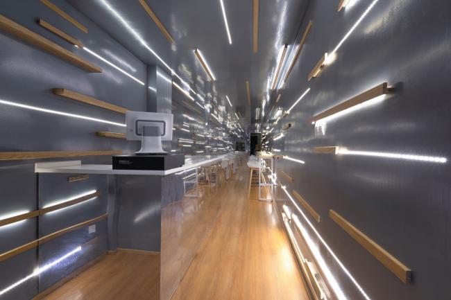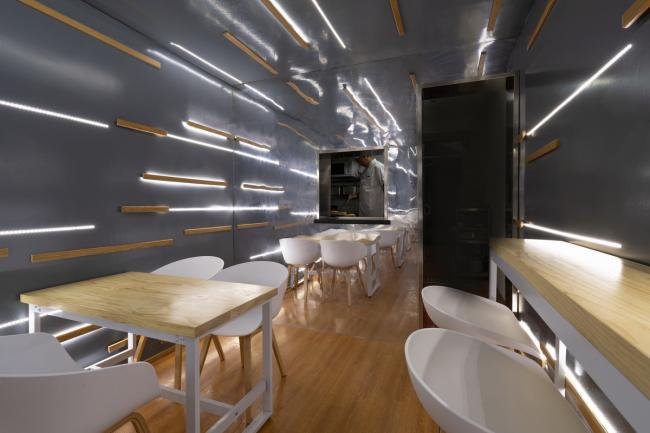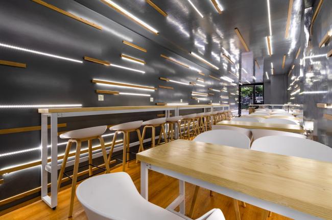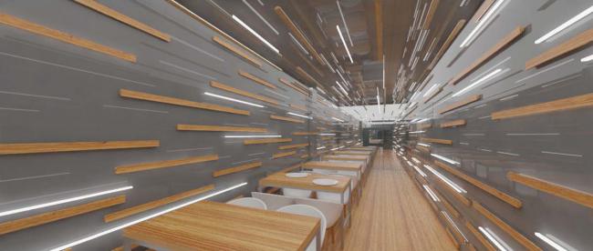 设计师在设计之前对菜品的品尝以及与大厨的聊天中,逐渐形成了味觉时光隧道的设计概念:在围合的墙面和顶面上均安装水平的线条——为增加墙面的多样丰富性和飞逝的效果。采用了木条和LED灯带两种材料的三种组合,在强调速度,促进一波又一波用餐者的更迭的同时,又强调出“隧道”极佳的延伸与进深感,以及光线为空间带来的流动感和活力。