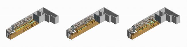 于是,一个完整的漫反射通道空间应运而生。整体设计空间分成两个部分:入口柜台空间、就餐区空间。首先是柜台空间,柜台仅以一台点单机作为与店员与顾客交涉的界面,其下“隐藏”店员工作区,形成(BIM建筑)具有层次感的柜台空间,十分简约。并在操作手法上,使用悬浮的概念:木条与灯带在镜面亚克力上的反射,使柜台与整个空间融为一体,柜台仿佛“漂浮”在空中。同时柜台局部的可移动设计满足店员进出的需求,以及在柜台旁留有的局部等候空间给外卖员进行休憩。