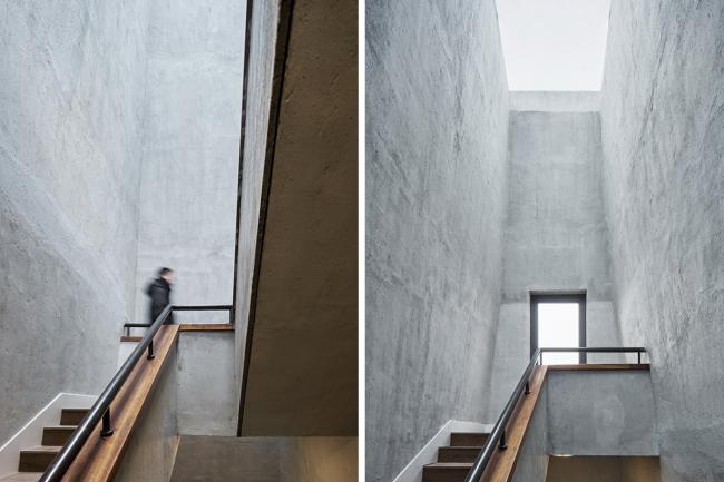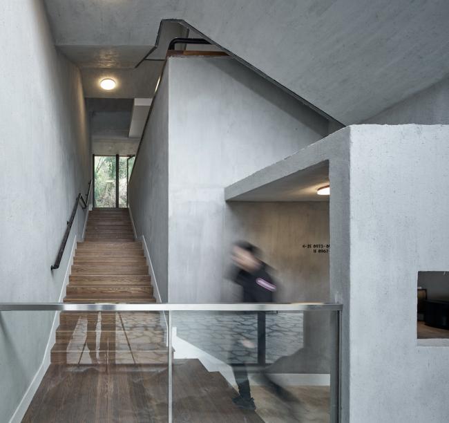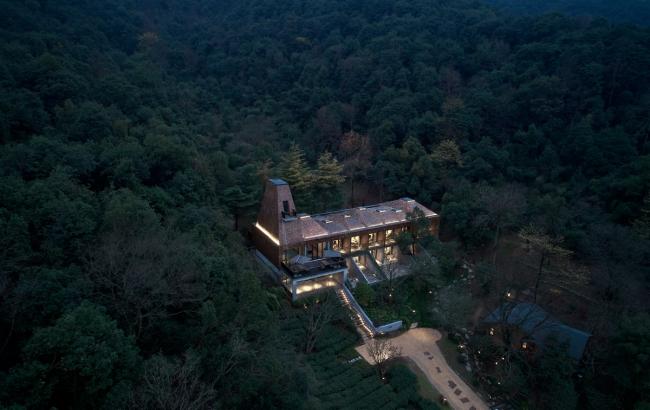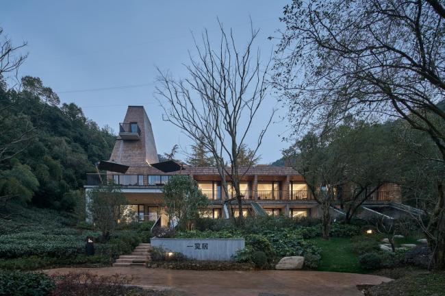 建筑风格呈现出一种对比的状态,一层采用传统手艺的水泥石灰参杂一定稻草,朴实而厚重,成为茶园的背景。二楼采用木饰面,与一层形成反差,漂浮在空中。不同坡度的略显随意的四坡顶形成变化的天际线与背后的一排松树交相呼应。场地中间的一颗大树仿佛从建筑中生长出来,这些都回应了场地特征:保护生态,植根于茶园,与松树互映。