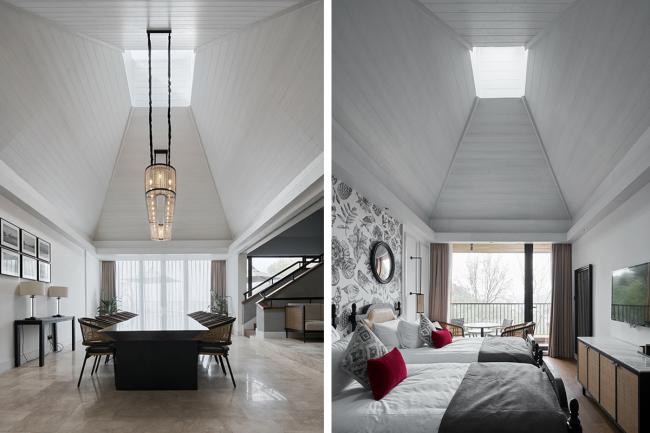 茶园植根于大地,松树耸立与蓝天,建筑便坐落在两者之间,成为茶园的背景,也与松树成为伙伴。建筑最终设计成两层的度假小楼,一楼强调与茶园的联系,每个房间设置花园,花园之间用斜墙分割,墙体远端深入大地,与茶园融合。二楼则强调与松树为伴,能够俯视茶园,远眺乐园。由于体量较大,每层6个房间,共有12间客房,便是在二楼设置了公共活动厅和室外露台作为共享空间。出于一开始就有登高望远的想法,顺着公共客厅继续向上爬两层高度做个瞭望台,(BIM设计)期望成为整个山谷的制高点(BIM),俯瞰整个主题乐园。地处相对幽静的区位和功能属性,非常适合公司团建和同学聚会等用途。