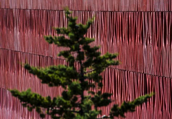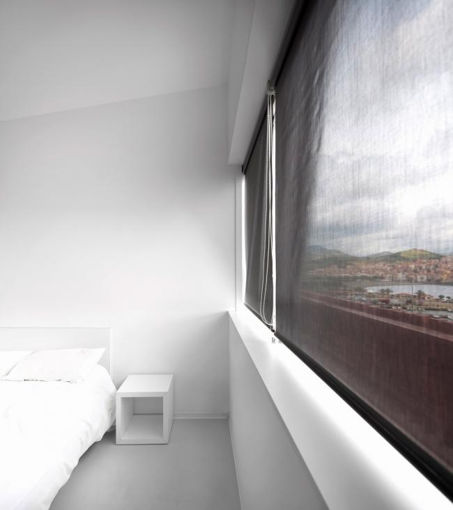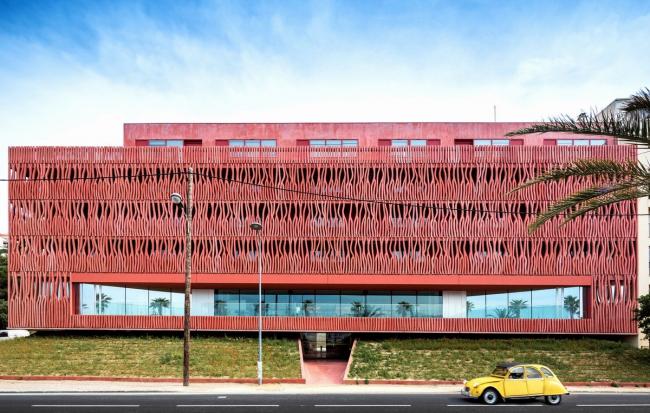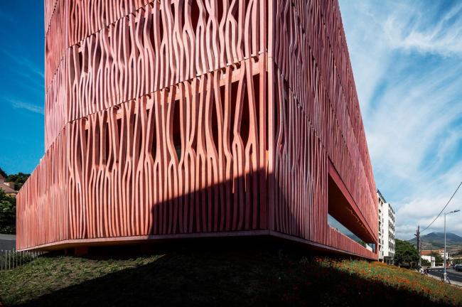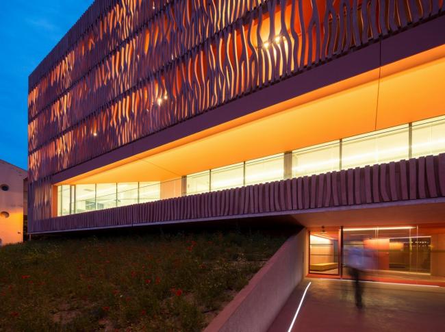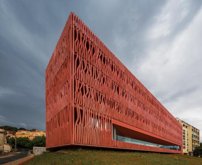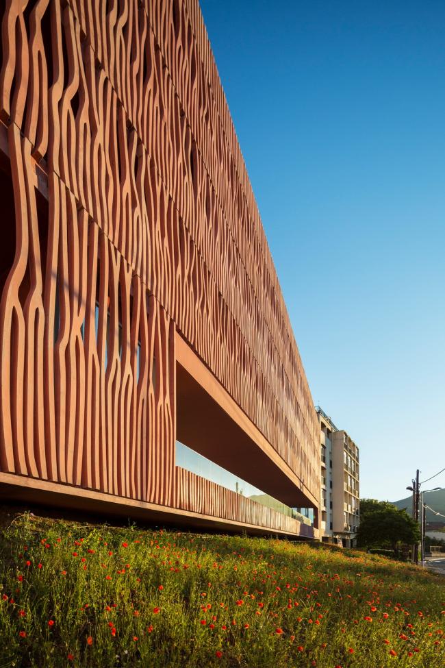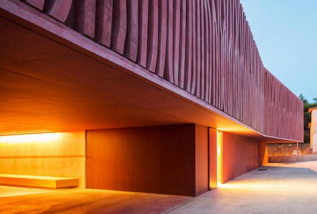 建筑位于海边,沿着现有的天空、地面还有地平线的地形继续延伸。它重新创造了视线与景观之间的关系,适应城市的建筑高度规划。赭色的色调回应了周围山丘和由内陆耕作梯田组成的土地。这些被葡萄园覆盖的山丘高耸于大海之上,闪耀着氧化铁深沉的泥土色调。