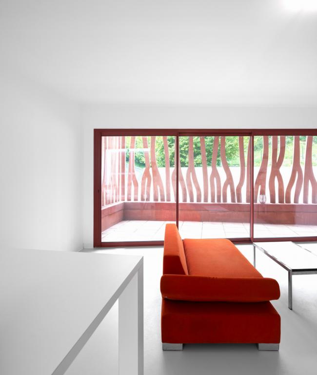餐厅在二楼。通过珊瑚网上的一个大裂口突显出来,这是一个将景观引入室内的窗口,视野开阔可以欣赏地平线和大海。色彩斑斓的混凝土网格同时也是栏杆和通向大海的视觉过滤器。它也是一堵墙,保证使用者、卧室和走道之间的亲密感。远处和近处的开口提供了微妙的变化。
