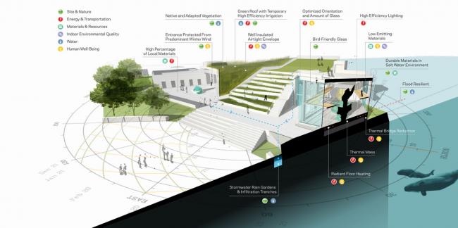 种植屋顶结合了当地的植被,通过收取和过滤雨水,使建筑非常隔热。建筑周围的场地种植原生草甸,为野生动物和候鸟创造了一个自然栖息地。这栋建筑位于500年历史的洪泛区之上,可以防止极端天气事件造成的破坏,比如2012年导致岛上断电的飓风桑迪(Hurricane Sandy)。博物馆呈现出一种与自然深度融合的新地质形态。