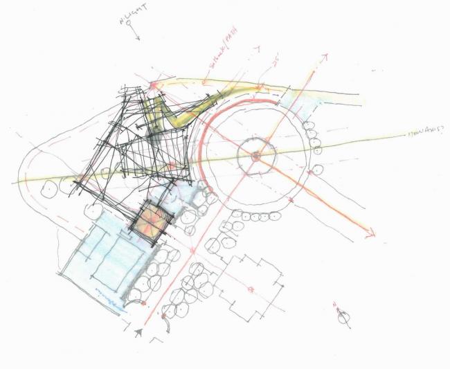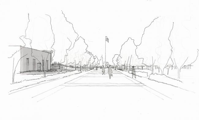 为避免拘泥于形式,广场采用了不对称的设计,它包含了戏剧性的背景,并随着游客进入、走在上面和围绕它而变化形式,如同自由女神的理念是多元化的概念。项目棱角分明的平面和丰富多样的空间让游客可以欣赏到岛上和纽约港的广阔景色。其动态表达的灵感来自于水边的不规则性,以及圆形旗杆广场的几何形状。由此产生的形式创造了一个视觉上的对比,伍德堡在雕像的底部,尽头是购物中心。堡垒和博物馆都有锐角;堡垒向内,博物馆向外辐射,赞美自由。