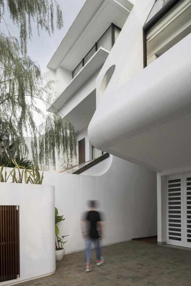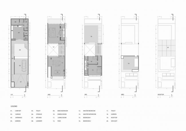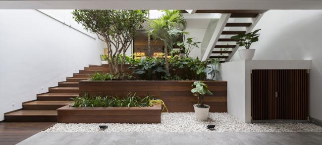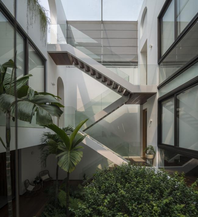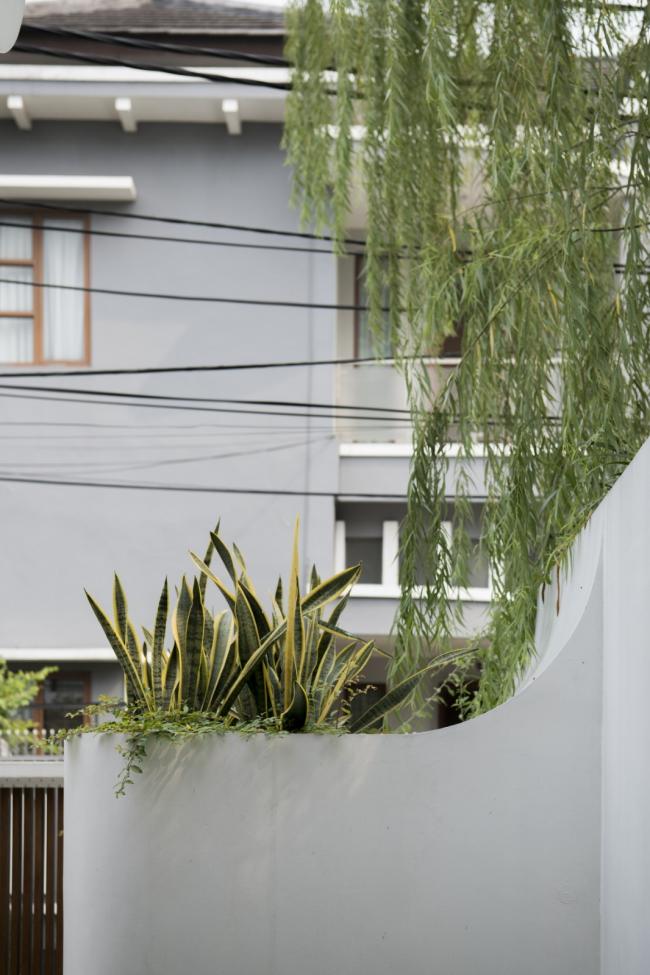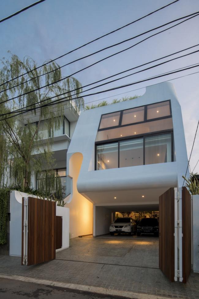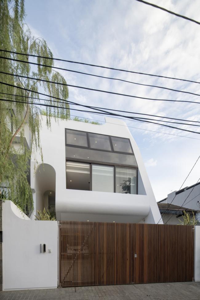 项目位于雅加达市中心,是一个宽7.5米,纵深30米的独特临街空间。这些场地条件影响了设计。在设计中,场地空间被划分为一栋三层和一栋两层的建筑,它们又带有一个前院、一个中庭和一个后院以保障交叉通风和面向花园的广阔视线。