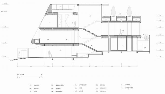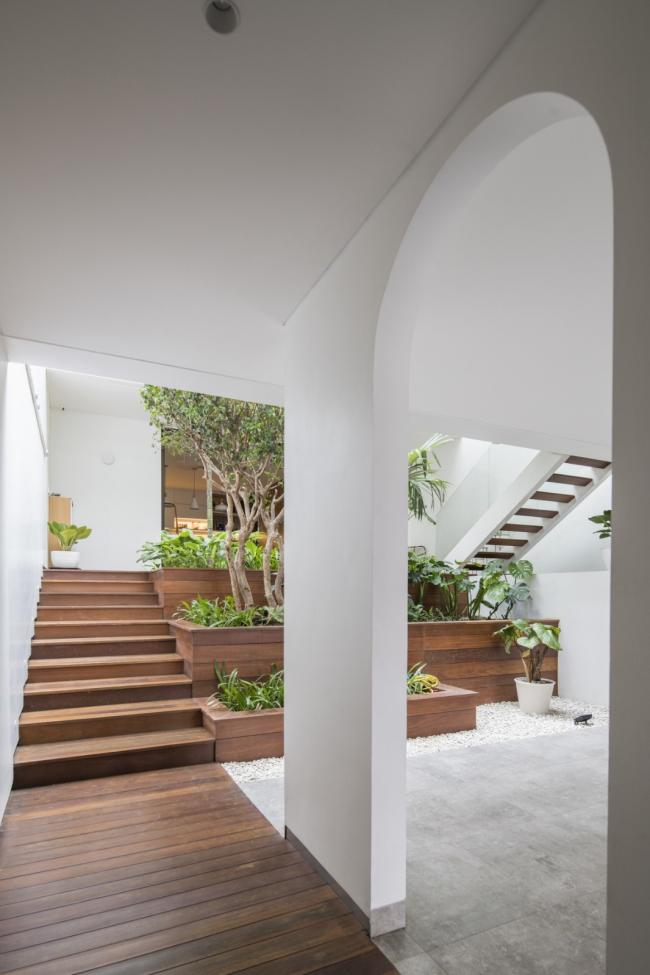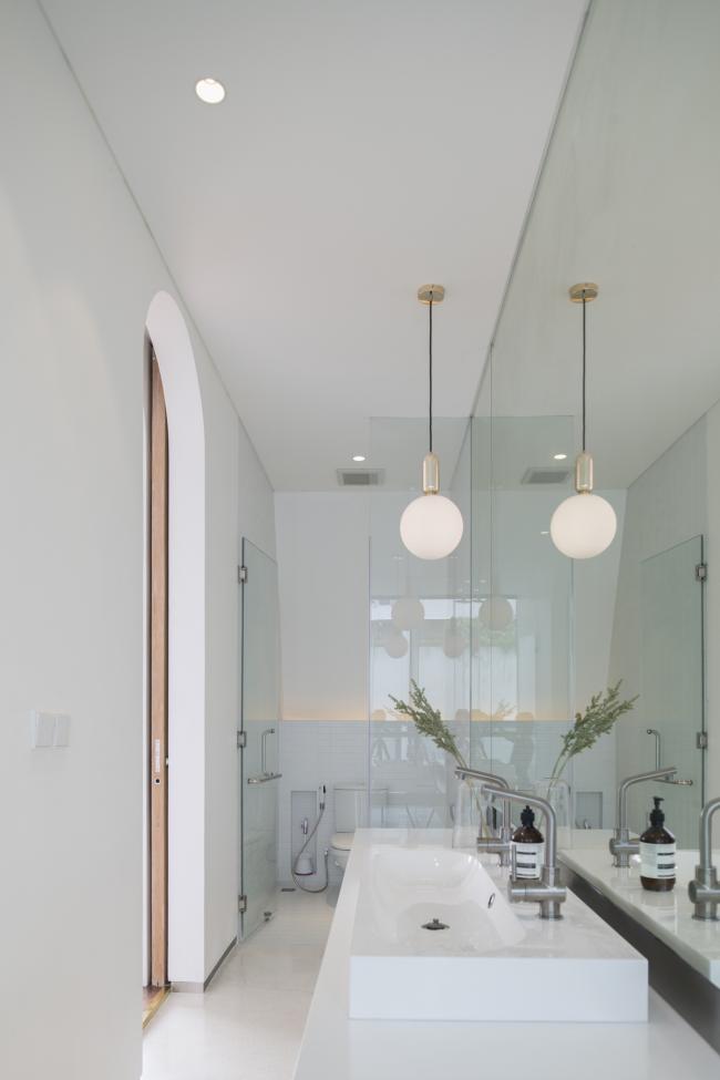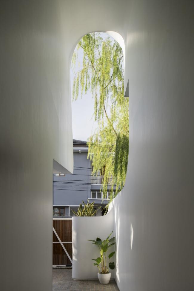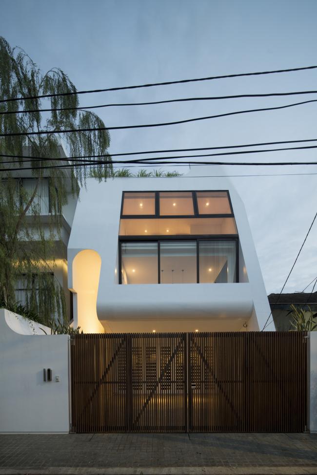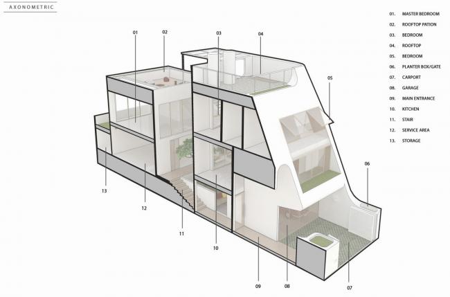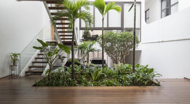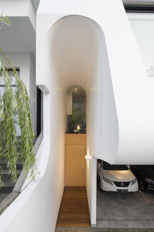 项目位于雅加达市中心,是一个宽7.5米,纵深30米的独特临街空间。这些场地条件影响了设计。在设计中,场地空间被划分为一栋三层和一栋两层的建筑,它们又带有一个前院、一个中庭和一个后院以保障交叉通风和面向花园的广阔视线。