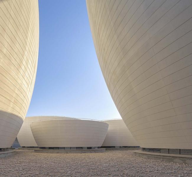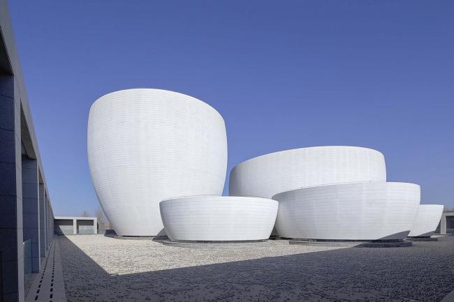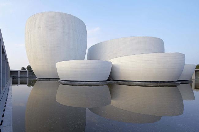 内部研究、办公空间和(BIM教程)设备用房像一道城墙,把博物馆从周边农田及低矮破旧建筑形成的杂乱日常环境中剥离出来;这道城墙的另一侧是开放的敞廊,围绕着一个从地面抬高的水池;对公众开放的展览空间像七件质朴的瓷器,漂浮在水面之上;水池下面是连成一体的入口和主展厅;对称但似是而非的宽大台阶连接着环廊、水池和北侧的广场。