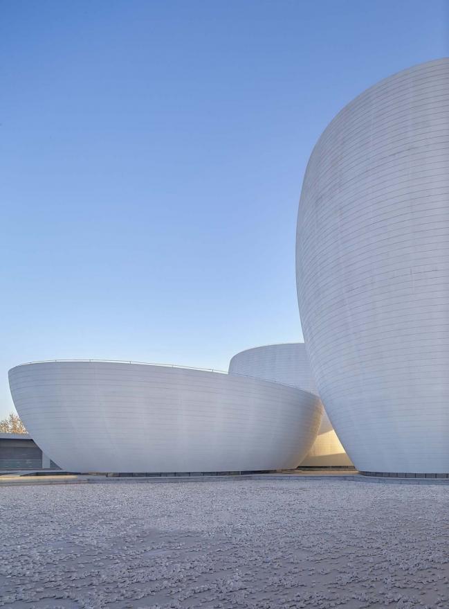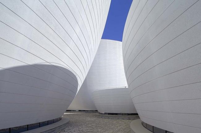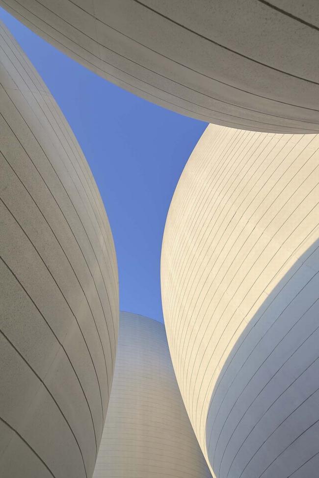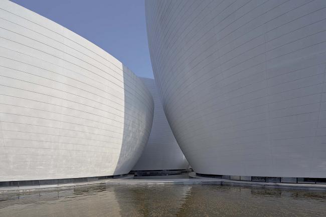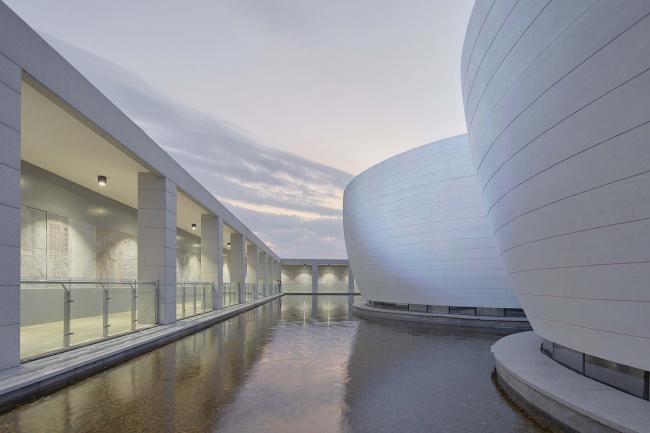 人们沿着正方形的敞廊漫步,不论在哪个位置,都会被中间的碗状造型吸引。夏日游走其间,可以细细体味一泓碧水在弧形外墙底部形成的粼粼波光;冬日移步至此,一抹暖暖斜阳将定格最美丽的瞬间。