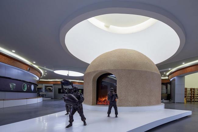 瓷器一般的展厅和相应的附属设施尺寸各异。我们在设计中使用圆形填充的算法作为几何控制图解,把它们聚拢为一个整体。