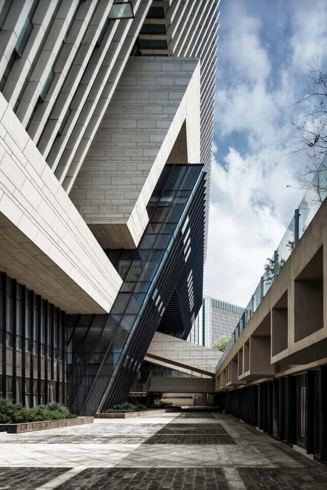 景观渗透:通过压低建筑的中部,将各馆脱开成庭院,辅以各式灰空间,实现室内外交融,并与周边城市开放空间互为渗透,为相邻待开发地块留出景观绿脉和视线通廊。