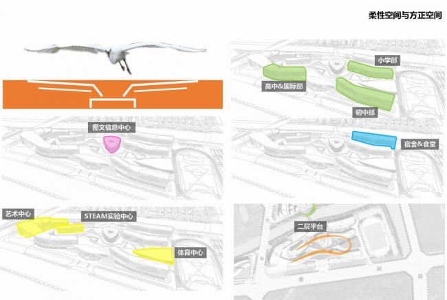 没有行政楼的校园与其他学校进门就是行政中心不同,整体学校功能围绕图文信息中心展开,设置了文化艺术中心,steam创客中心,体育活动中心三大功能体系,将教学楼、宿舍后勤等功能穿插其中。整体学校的功能布局上在与校方多次讨论之后(建议去掉)取消了行政办公楼的设置,将学校的空间最大程度的释放给学生使用。将教师的办公和其他行政功能接轨国外学校,分别设置在教室内以及校园功能空间外的零碎空间。