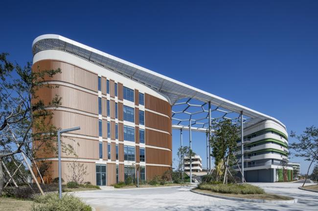 由于地块南北狭窄的缘故,校园的主入口设计有一定的特殊性,如果设计失误要么会堵住整体校园,要么会造成一眼看到底,经过与校方的商议,校方希望校园的入口有一定的形象,同时希望学校的一些活动可以直接在入口举行。综合了多方的因素后,设计大胆的将校园的入口设计成一个开放曲面弧形结构,整体通过左右的钢柱支撑,弧形结构下的空间形成开放式的入口,入口下设计了四个小型的序列空间,用于校园历史及活动的展示。由于弧形结构突出整体建筑,并用木色的铝制百叶包裹,形成具有鲜明特色的入口形象。,同时由于巧妙地使用弧形结构下方完整(BIM工作)富余空间的空间完整且具有一定的高度,自然形成打造成整个校园的户外剧场,2017年预开学及2018年这两年的连续两年新生开学典礼都在此举行。至此,校园的入口兼具了引入空间和聚集空间以及展示空间的功能。