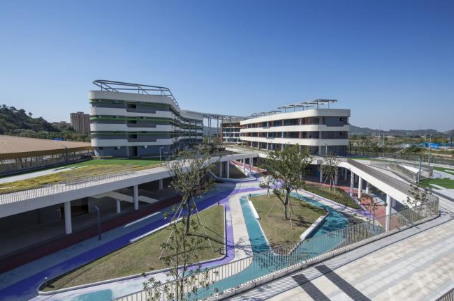 项目地湖州是著名的“丝绸之乡”,设计以丝绸“柔顺”之意作为整个学校空间流线塑造的基调,力求打造一个空间柔和,流线顺畅,不同于“兵营式”布局,能体验到空间层次丰富的学校。