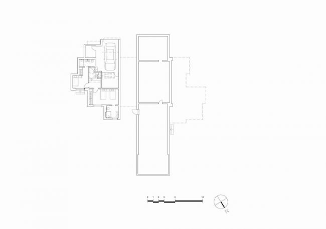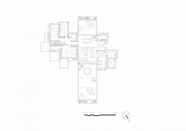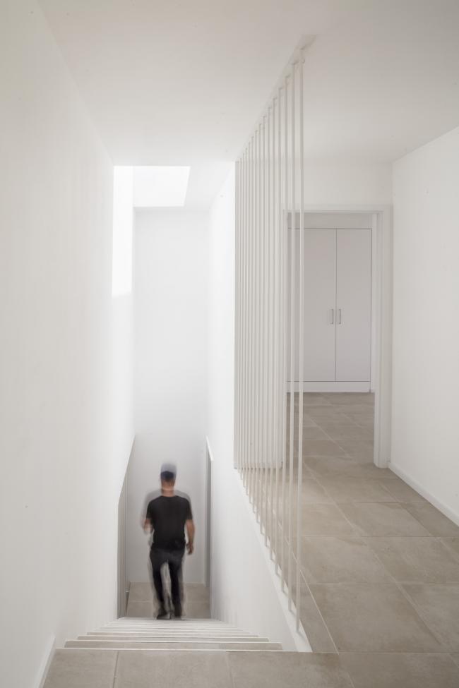 此外,走秀台作为线性的混凝土元素,清晰划分开日间与夜间活动区。在它的两侧有着3×3米的网格,组织了一系列包含服务和卧室在内的像素化单元。不分房间可以直接通往露台,花园或庭院。这个项目中,单元的突破使我们避免了过多的图像,并将体量嵌入景观。这种建筑与自然的融合进一步强调了房屋下面穿过的空隙,避免阻碍视觉连接。走秀台与温馨夜晚和服务区相对立,因此朝着景观展开了5米的悬臂式门廊。从这里可以到达日常生活的所有房间却不失去两个主要景观之间的联系。