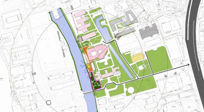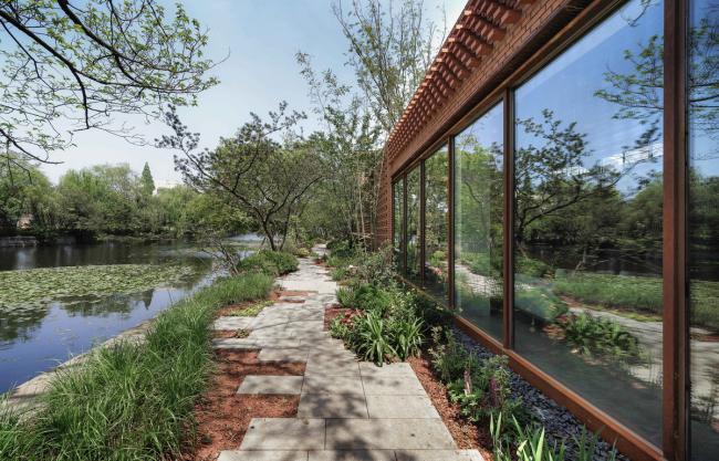 项目位于华东师范大学丽娃河畔,西侧为河道,东侧紧邻丽娃路,南至丽虹桥,北至动力科截止。沿河道由北向南依次分布学生宿舍区、教学楼区、教师生活区三大部分,而基地处于核心的教学楼区,也是整个校园十字形空间轴线的中心。