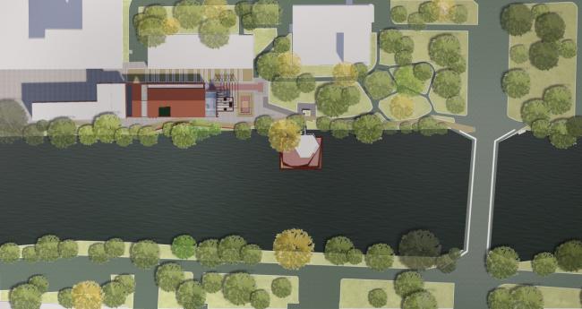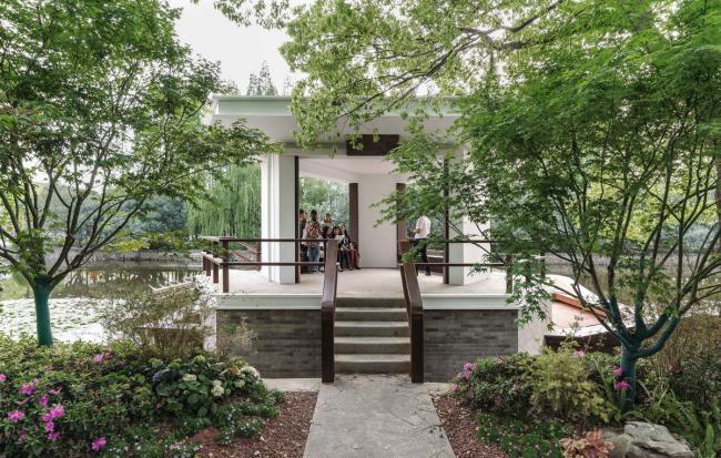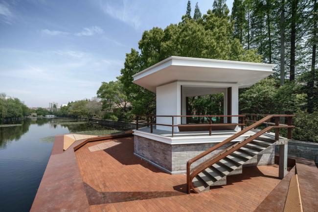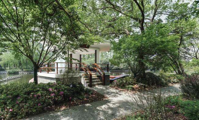 在侧亭的修缮设计中,通过对亭身做最大程度的保留,拆除原有玻璃门窗,将空间打开。并将底座加以修饰,通过折线形的处理,将底座修缮为雕塑的形象,意示历史之舟,承载着华师大辉煌的校史,亦如一盏水灯长燃希望的烛火漂浮在河面上。