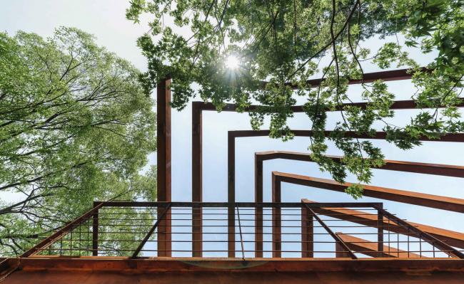 在书吧与侧亭之间设置下沉广场,有助于汇聚人气。下沉广场通过台阶高度的不同,自然形成可供人休憩的空间。中间种植榉树,遮阴的同时,形成空间的聚合性。