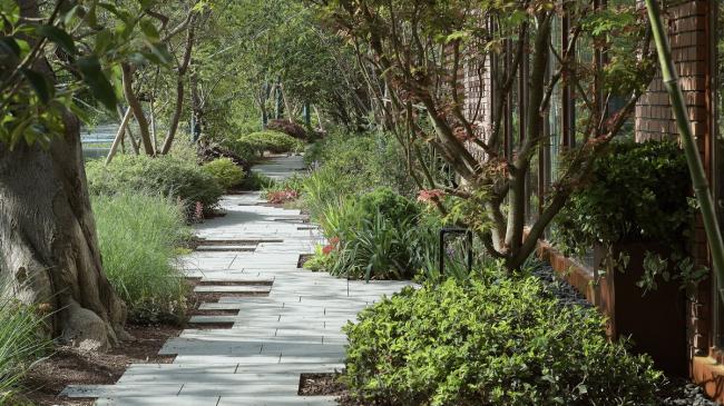 楼间小道作为书吧与行政楼之间的部分,同样采用折线性的铺地,使空间具有引导性。