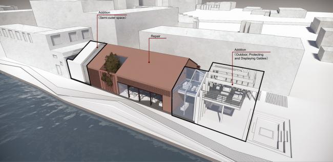 在修缮过程中将周边空间进行整合,在保留原有建筑形式上聚合阅览、展示、品茶、休憩等综合性功能,满足学生、老师、市民,不同人群的需求。将通过性空间变为可停留性空间,提高丽娃沿岸的空间品质感。