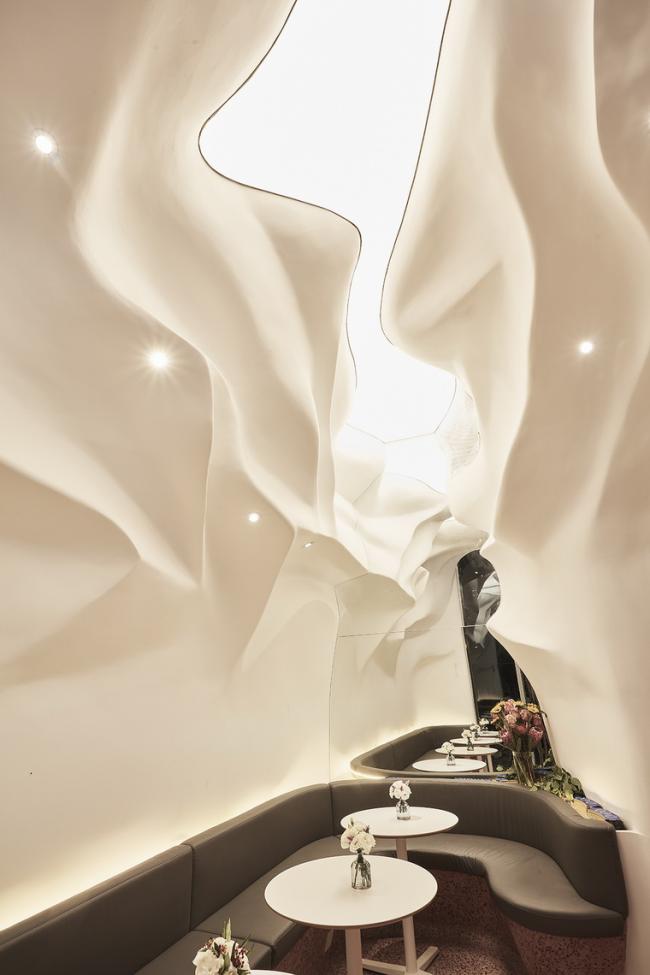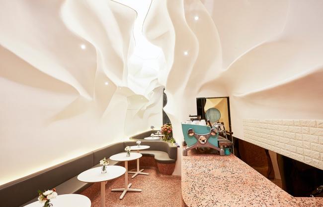 随着日与夜的交替,这间30平米的店铺也在咖啡馆和酒吧之间切换着身份。纯白的曲面背景与投射在这背景上千变万化的奇妙影像,赋予空间情绪,让空间多变且有趣。