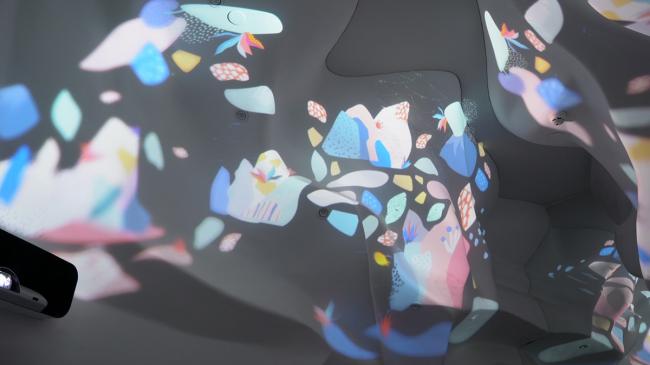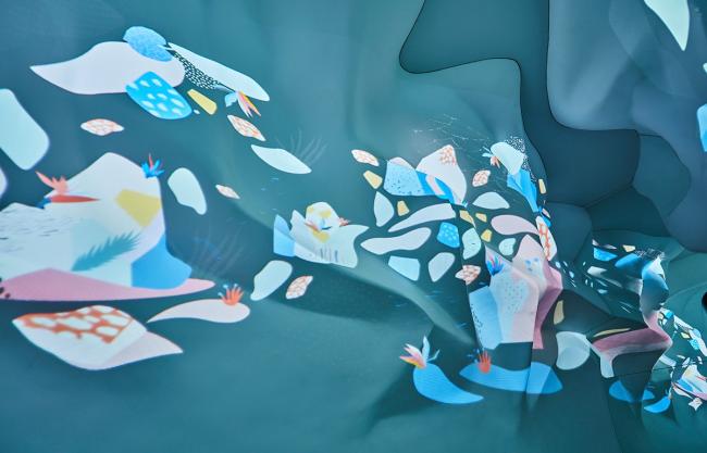 当视频的投影,投射在凹凸的曲面背景上,它的视觉效果重现出透过海浪折射所产生的光学畸变效果,让海底画面惟妙惟肖。置身其中,仿佛置身海底的幻境。