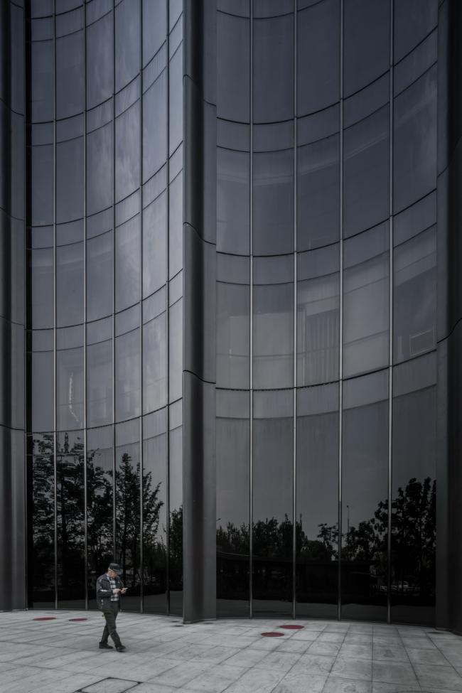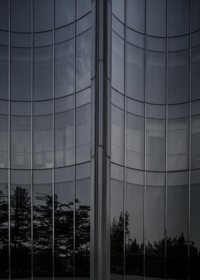 建筑外观整体色调呈深颜色,形体基本以曲线为主,给人一种安静神秘的并附有未来感的印象。除了可使自然光全方位透入建筑外,玻璃的深颜色也有效地减少阳光直射所产生的热能。