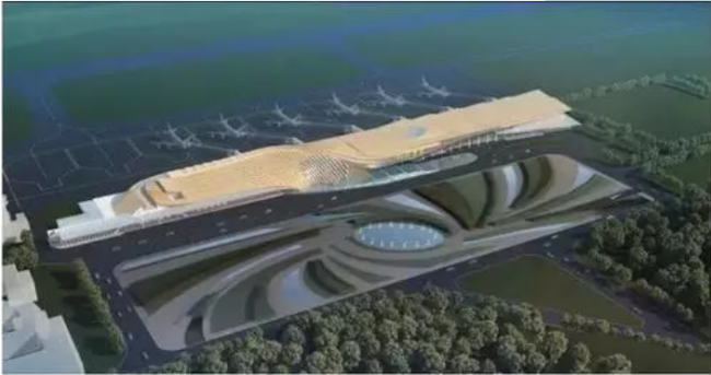 该项目为铜仁机场航站楼改扩建工程,其规划建设用地面积为58000㎡,总建筑面积11887.35㎡,总高度为19.9m,地上二层,设计使用年限为50年。项目的设计者采用了当地佛教文化中的凤凰转世主题,采用双轨扫掠,曲面翻转的手段使得机场整体造型形似佛教中的法螺,寓意凤凰转世,生生不息。俯瞰又犹如凤凰的转世吉鸟——孔雀。机场表面的金属铝板随形体变化或舒张或紧收,在阳光的照耀下宛如孔雀绚丽多姿的羽翼。