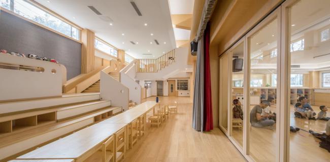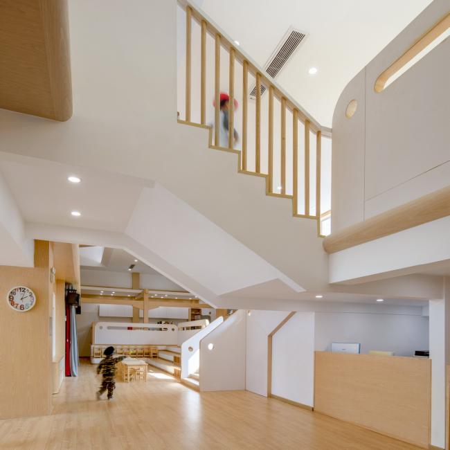 为了与国际教学标准结合,前侧课室分为上下两层:一楼设置木工课室和舞蹈课室,二楼设置美术课室和科学课室。通过合理的学习分区、多样化的师幼互动突出STEAM多学科综合教育的概念。后侧的自由探索空间通过空间内的主楼梯,将滑梯、儿童阅读平台、开放式儿童烹饪教室及角色扮演区等分段式穿插在空间内。