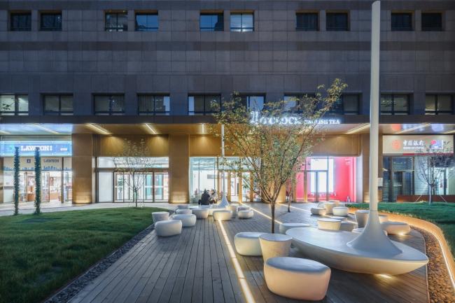 在室外景观改造上,设计团队增加流畅线条的景观,延伸外部休闲平台,打破原有建筑与城市空间之间的隔阂,营造非正式交流空间氛围,增进办公社区的活力。另外,设计团队延续设计元素,为建筑打造了一体化的品牌标识系统。