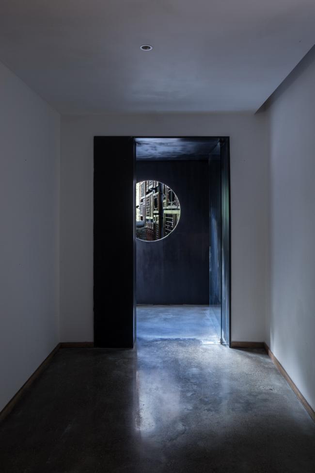 ▲主体建筑内回看入口廊道(圆窗中可见二层辅楼局部立面)©赵奕龙