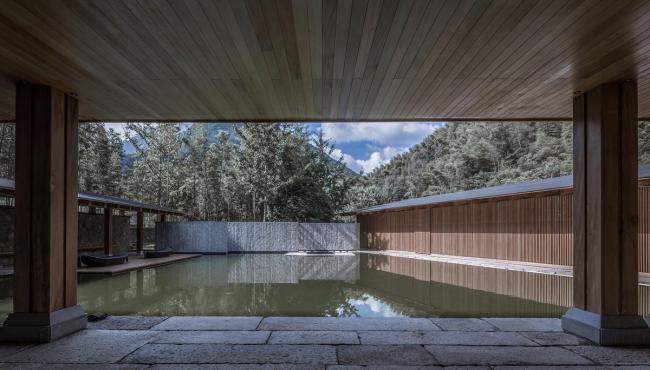 大堂前的浅水池构成了静院的主体。它既体现了 “空”——接近无物的禅意,又将山林与天空在咫尺间倒映,让人在压低的檐廊下更多看见的是其在水中与用原建筑屋顶的瓦片铺就的池底相映衬的虚幻倒影,一种太虚幻境的山水意境被宁静的一亩方塘激发出来。而同时,基地旁溪水的隆隆声响又时刻提醒着外部现实的存在,现实、想象与记忆在此混合,共同定下静院的场所氛围基调。