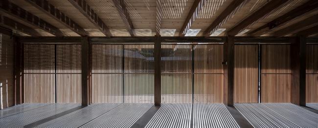 茶亭朝内一侧界面为连续的细木格栅固定单元,从内院看,细木格栅遮挡了茶亭的结构柱,纯净的细木矩阵与平整的沥青瓦屋面具有类似细腻质感的二维化界面,共同衬托着上部与背后渗透进内院的山林景观。从茶亭中看,这层界面在木柱后方,如织物般将内院的水色天光过滤,在内部地面与屋面上投射出细密的光影,水院景色呈现为一种边界模糊的梦境。