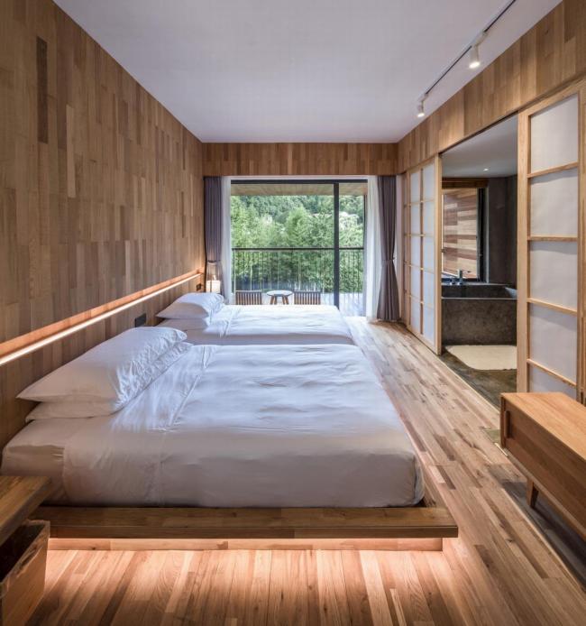 ▲阳台内部看山林溪水,右侧为完全打开的客房立面©赵奕龙