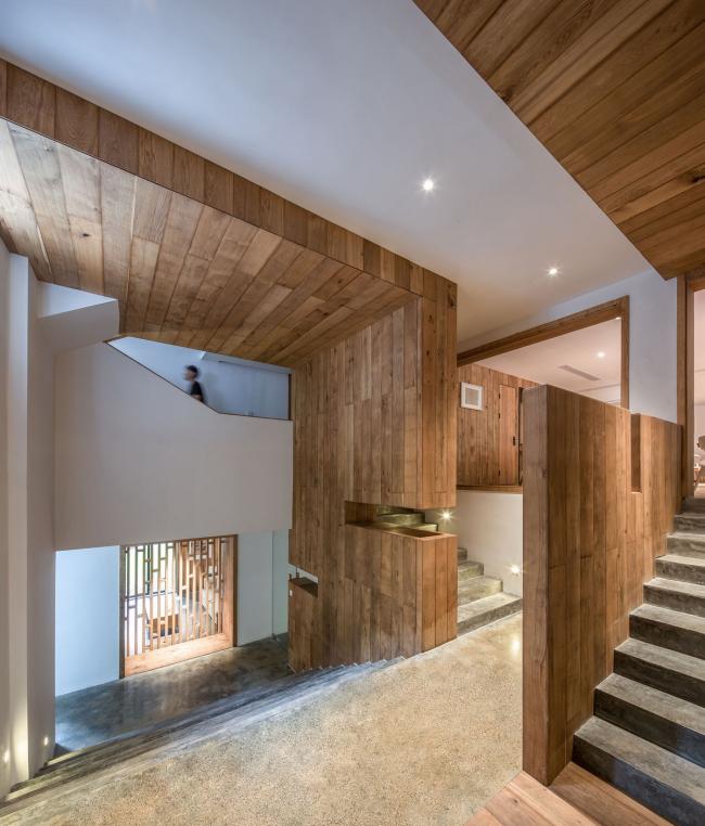 设计将四层楼主体建筑的主入口从北侧正立面转移到建筑东侧山墙——由木廊架、二层独立辅楼和主体建筑围合的三角形区域内。从阶梯上来一直到山墙边,动线出现了非正交的转折。这一动作,首先将陡坎和主体建筑山墙之间的偏角以动线的连续边界整合;其次,原本台地上细碎的外部空间也被动线切分为入口三角院和内庭水院,两个院子都拥有了迥异的气氛和尺度;再者,在三角院与内院重叠处的一条短边界面上,我们设置了可以从一角窥视内部水院的横向窗洞,定格了内部水院可望而暂不可达的静谧画面。