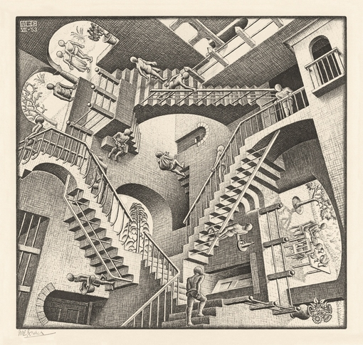 ▲M.C.埃舍尔(M. C. Escher)《相对性》Relativity,1953