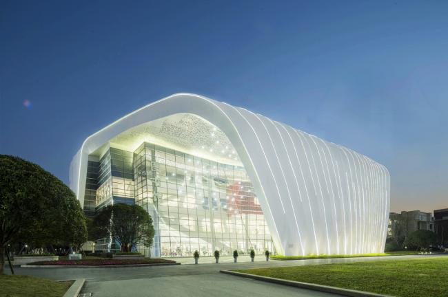 图书馆形态源自灯笼花优雅的外形,北侧和东侧以实体墙面为主,宛若花朵枝叶包裹;西侧和南侧是如灯笼花瓣晶莹剔透的玻璃幕墙。几条流动的曲面勾勒出花朵的动感形态,与其周围教学楼、宿舍楼相映成趣,成为整个校园的地标和视觉焦点。