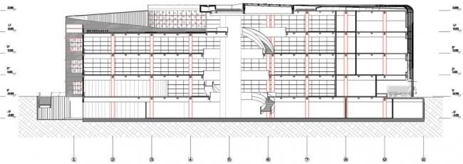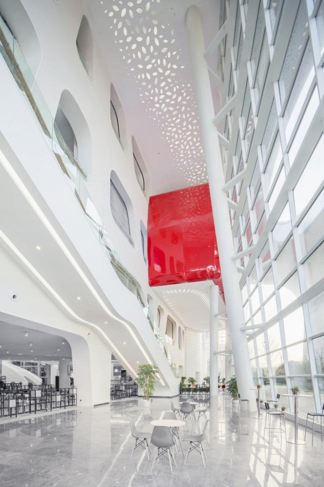 北侧图书馆主入口作为校园中轴线终点的背景,与校园肌理完美结合。在图书馆中心是层层退进的椭圆形主中庭,通过特色旋转楼梯宛若灯笼花蕊,成为整个建筑的核心。