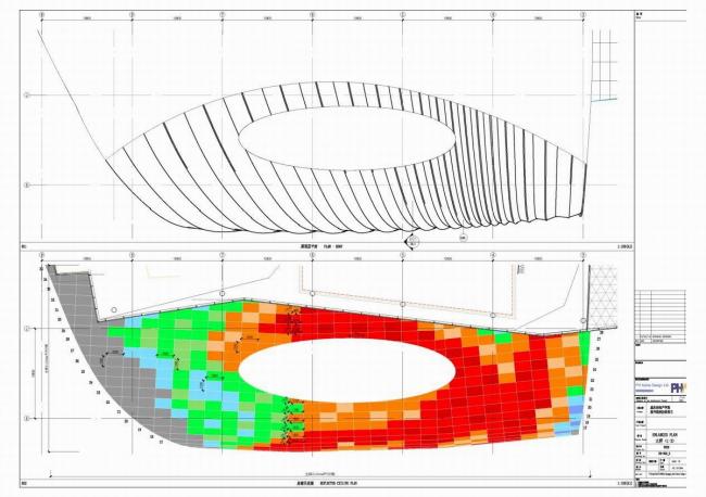 大屋盖的内部,我们采用“星空”的概念来隐喻莘莘学子探索未知世界。屋顶的椭圆形洞口如同星系的中心,星光环绕中心形成星系的图案,越靠近洞口星光越密集。为了完成这样的设计意图,我们采用“花瓣”和“圆形”的母题,通过疏密的变化,设计了四种图案在穿孔铝板上面,通过精心的设计布置,形成了“星云”般的图案。所有铝板都是以2000mmX1200mm的长宽尺寸作为标准件进行拼接,其中包括四种图案的穿孔铝板与一种不开孔的实面铝板,共五种图案组成北侧屋盖内表面的图案。