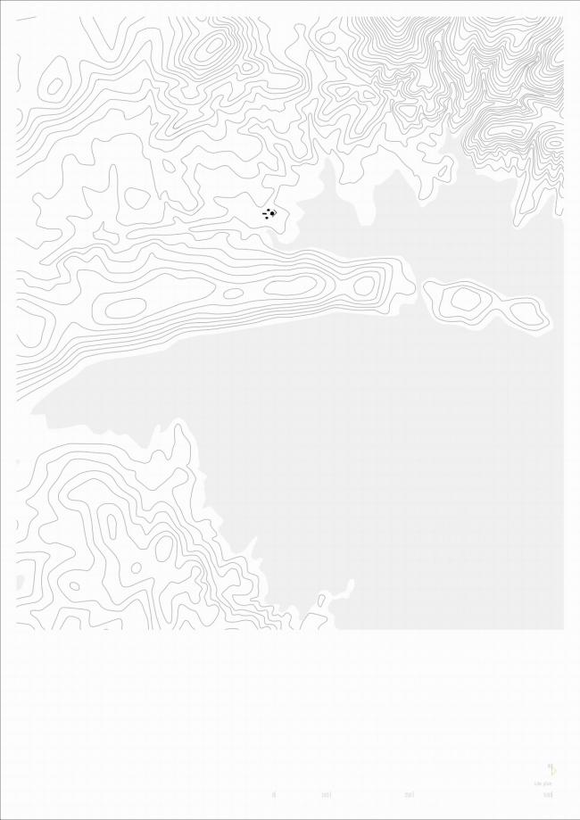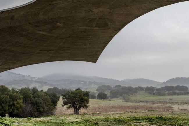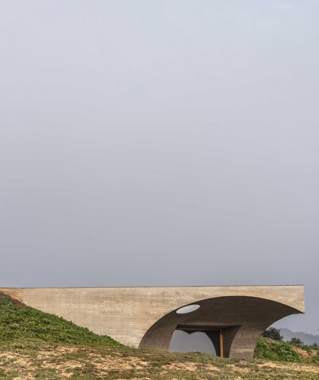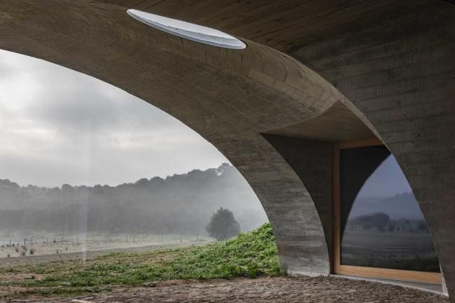 利用地形浇筑而成的穹顶结构覆盖整个社交空间,而这便是是房子的生活中心。 一个倒穹顶与其相交并创造出一个开口得以照亮空间,塑造其精确的几何形状以及边界。 而卧室通向圆形内庭。