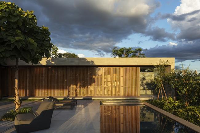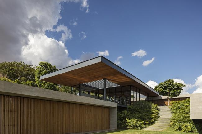 利用素混凝土、暖色木材、金属结构和通透的玻璃,搭配郁郁葱葱的景观设计,建筑营造出来的是一个现代但不冰冷的形象。通透的玻璃和自然材料的使用增加了建筑与自然的联系。为增加建筑的生态性,建筑师在第二个体量上设计了一个绿(BIM工程师)草屋顶。这些细节的设计同时增加了建筑的热气循环,而对于当地炎热的天气,这是至关重要的。
