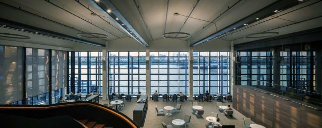 改造后的项目提供了比原先计划更多的公众空间。设施分类为付费跟免费空间,确保中心能服务到所有人群。为了让改建工程不会去掉原本的历史色彩,如非实际和功能上的需要,设计尽可能以保存印刷厂风貌为大前提。从入口,走下特设的绿化梯阶,方可直达湄南河边。